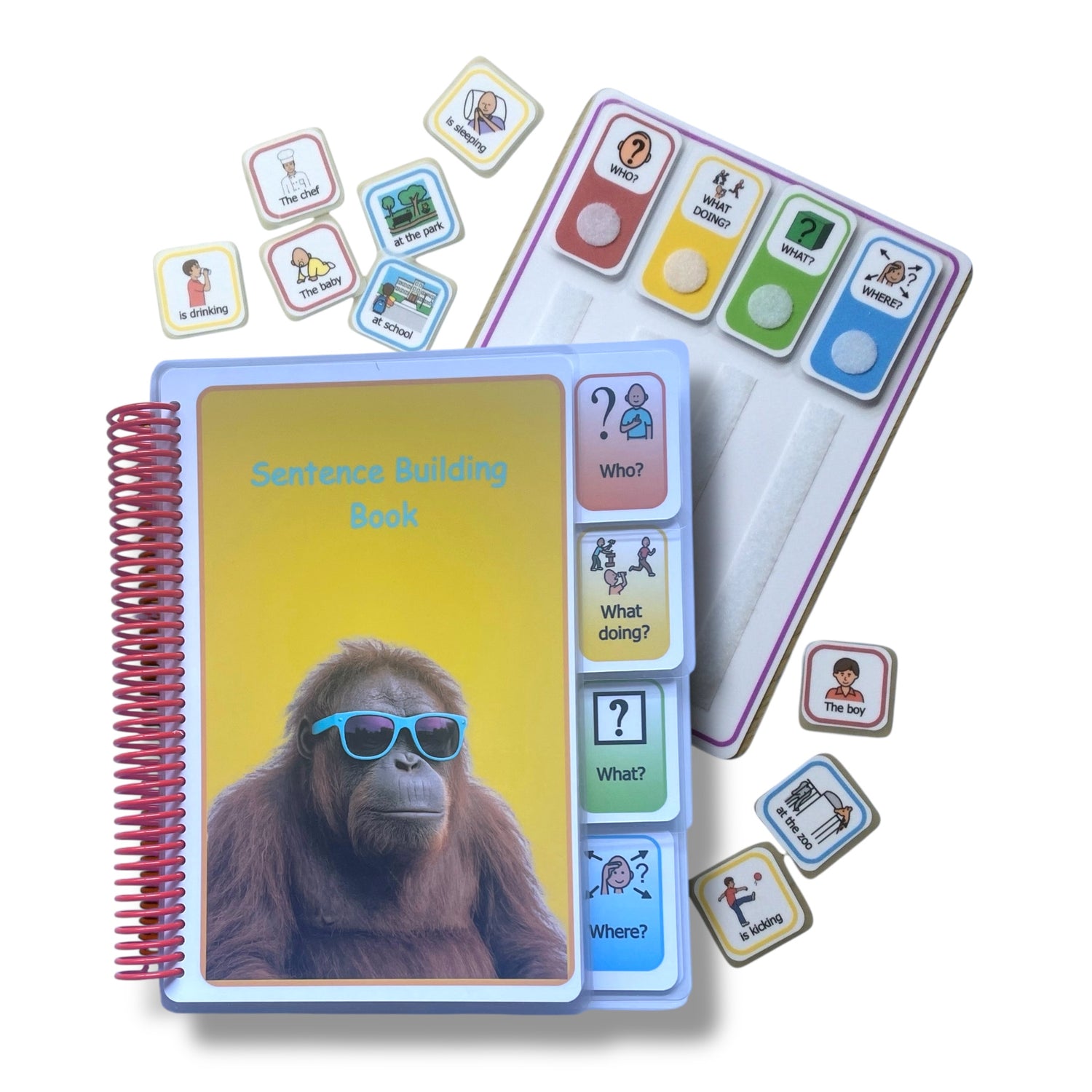 The WH symbols on the main display board are interchangeable so beginners can start with just one WH word and expand as they learn, gradually fading out the visual choices. The individual symbols can be rearranged if you wish to also include an adjective once the user is advanced.
